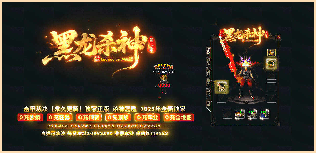 ★黑龙杀神★:已经稳定开放半年,10倍充值,百倍爆率,千倍激情,万人拿沙,所有装备靠打,白嫖永远不死!